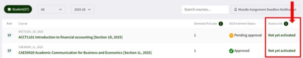 - If there is no access link and shows Not yet activated, it means the course is currently set as “Hidden from students” by the course teacher.
