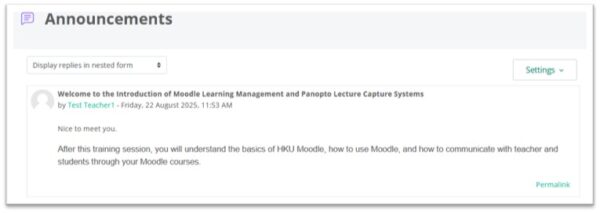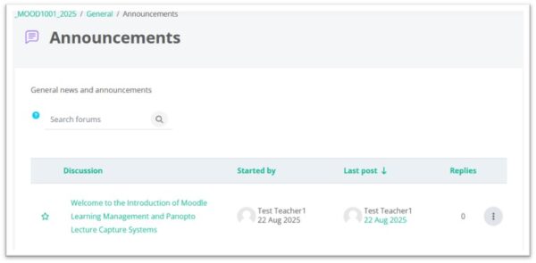 The Announcements is a special forum for general news and announcements. By default, it is placed in the top of the center section and only teachers and administrators may add posts or reply to posts.