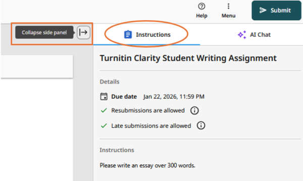 - Open the Instructions tab in the side panel to view assignment requirements and due dates.