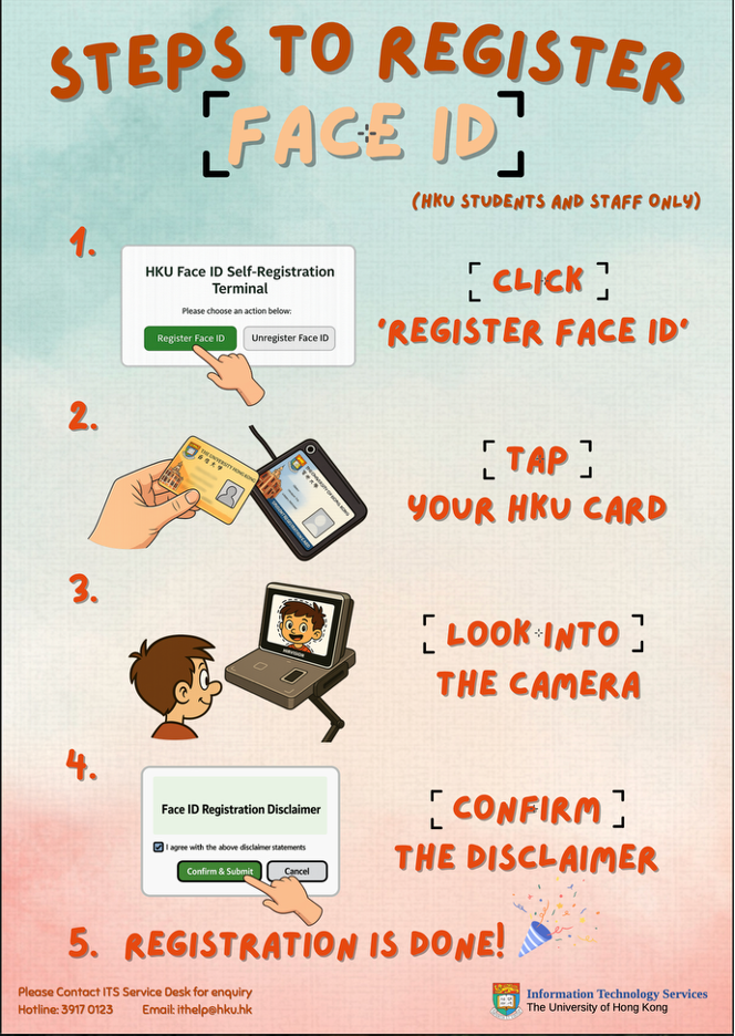Registration is voluntary; however, it is required to enable Face ID for access. The biometric data will be stored securely as encrypted templates on protected servers and will only be accessible to authorized personnel, in accordance with HKU’s Personal Information Collection Statement.
